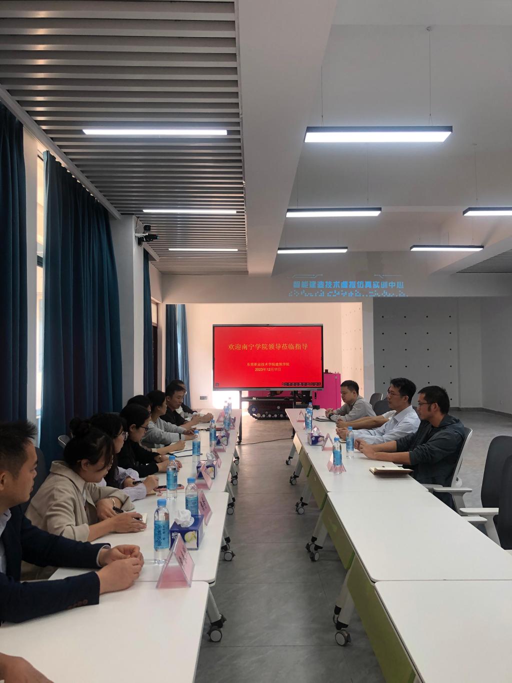 陈艳艳副院长一行参观了建筑学院示范性智能建造虚拟仿真实训基地和建筑实操基地等实训基地。会上,杨润丰副院长对南宁学院一行的来访表示热烈欢迎,并介绍了我院发展历程、办学特色,以及我院在智能建造技术专业课程及实训室建设等方面的情况。